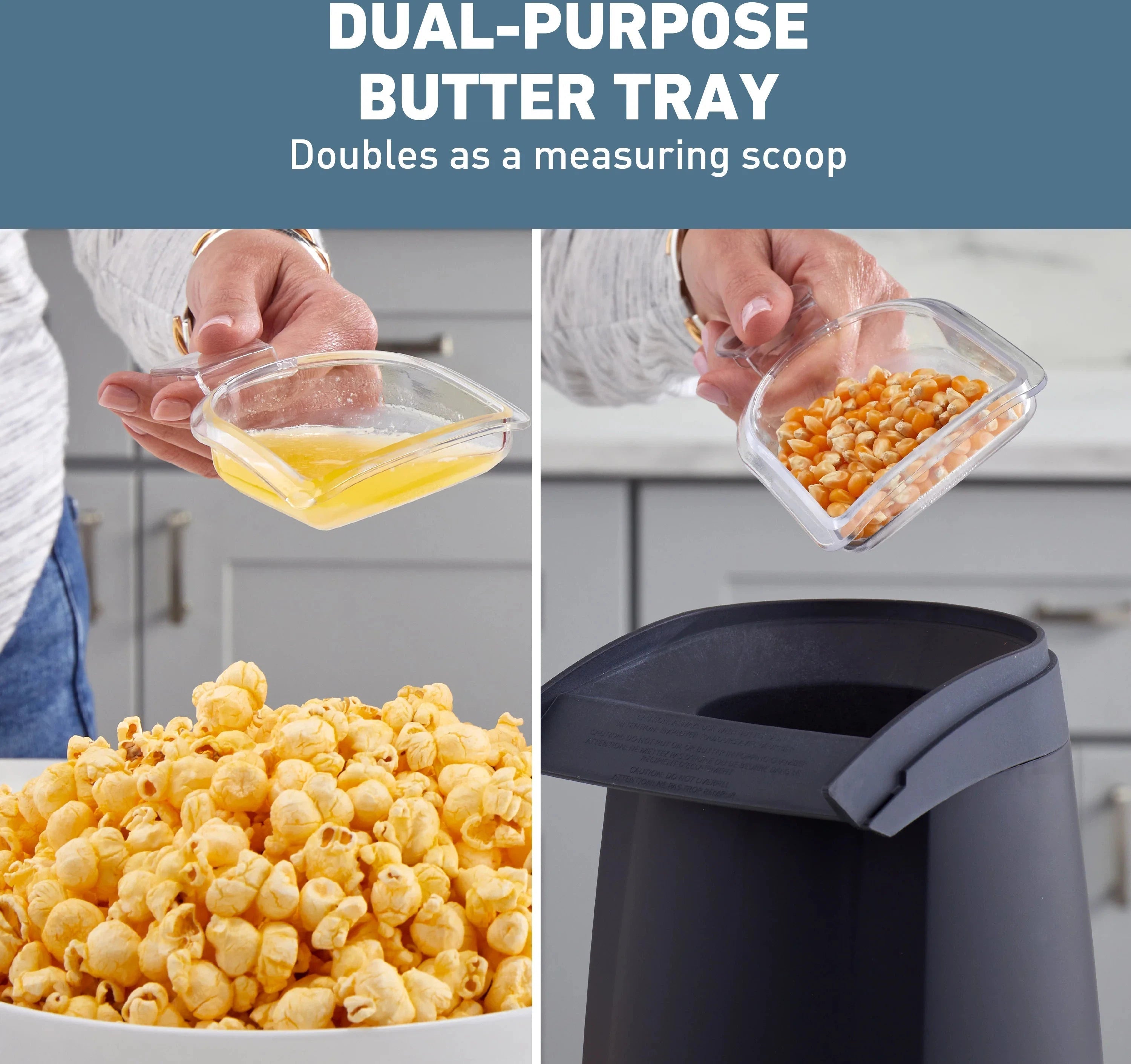 - Dual purpose measuring scoop doubles as butter melting tray