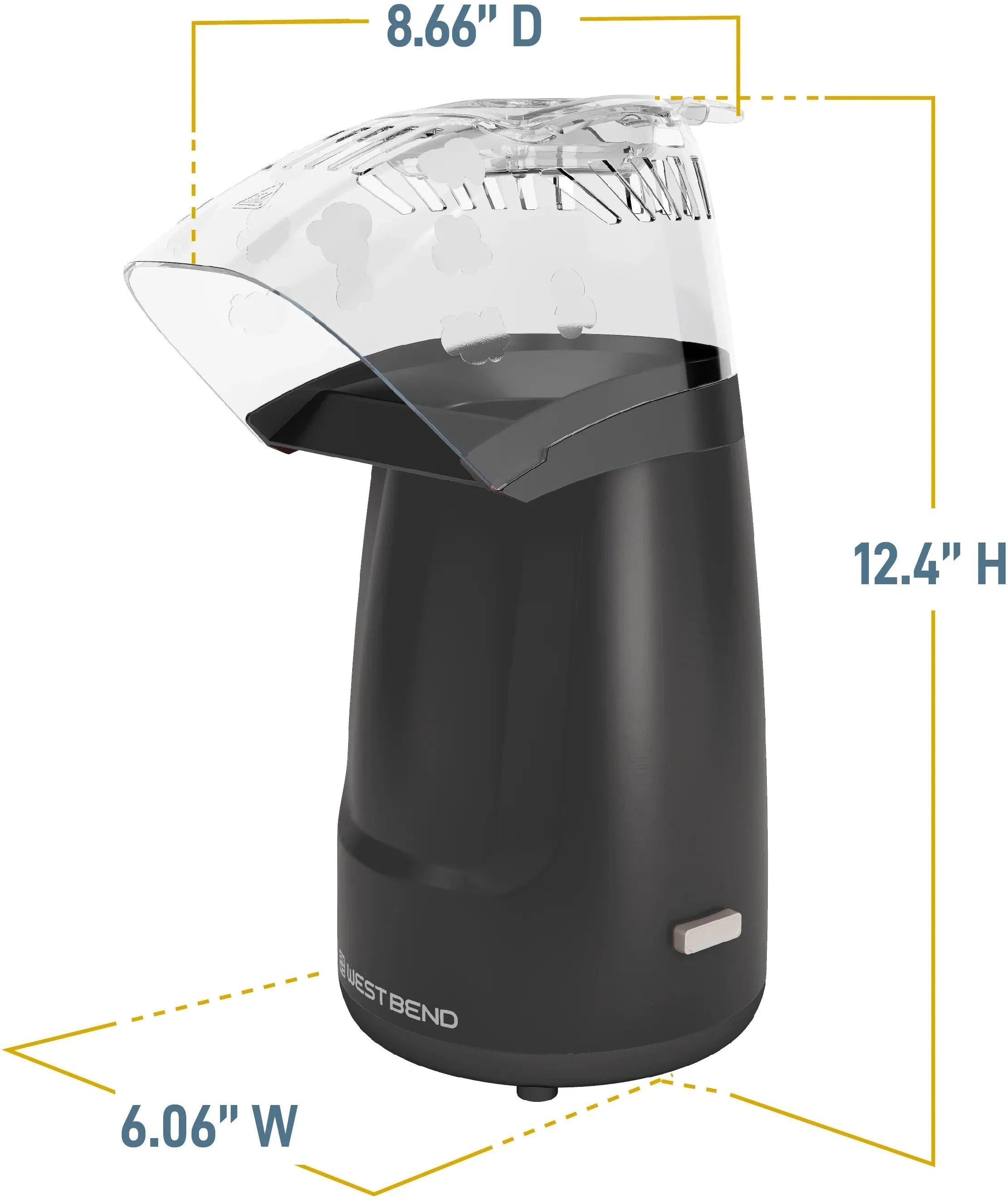 Healthier snacking made easy with the West Bend Air Crazy™ Hot Air Popcorn Maker. Whether it's for everyday snacking or at-home movie nights, you can feel good about serving hot, fluffy popcorn popped the healthier way with hot air, not oil. This 4QT, easy-to-use, compact unit pops up to 16 cups in about 3 mins. A simple on/off button makes operation a breeze. Use the dual-purpose measuring scoop to ensure the right amount of kernels are used and to melt butter for additional flavor. The unit also features an on-board cord storage for easy, no-tangle cord storage under the cabinet. Snack smarter with every pop with the west bend air crazy hot air popcorn maker. Covered by the West Bend 12-Month Limited Warranty.