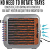 The powerful 900 watt heater and quiet, rear-mounted fan work together for even, consistent drying of foods on every tray from top to bottom. No need to rotate trays.