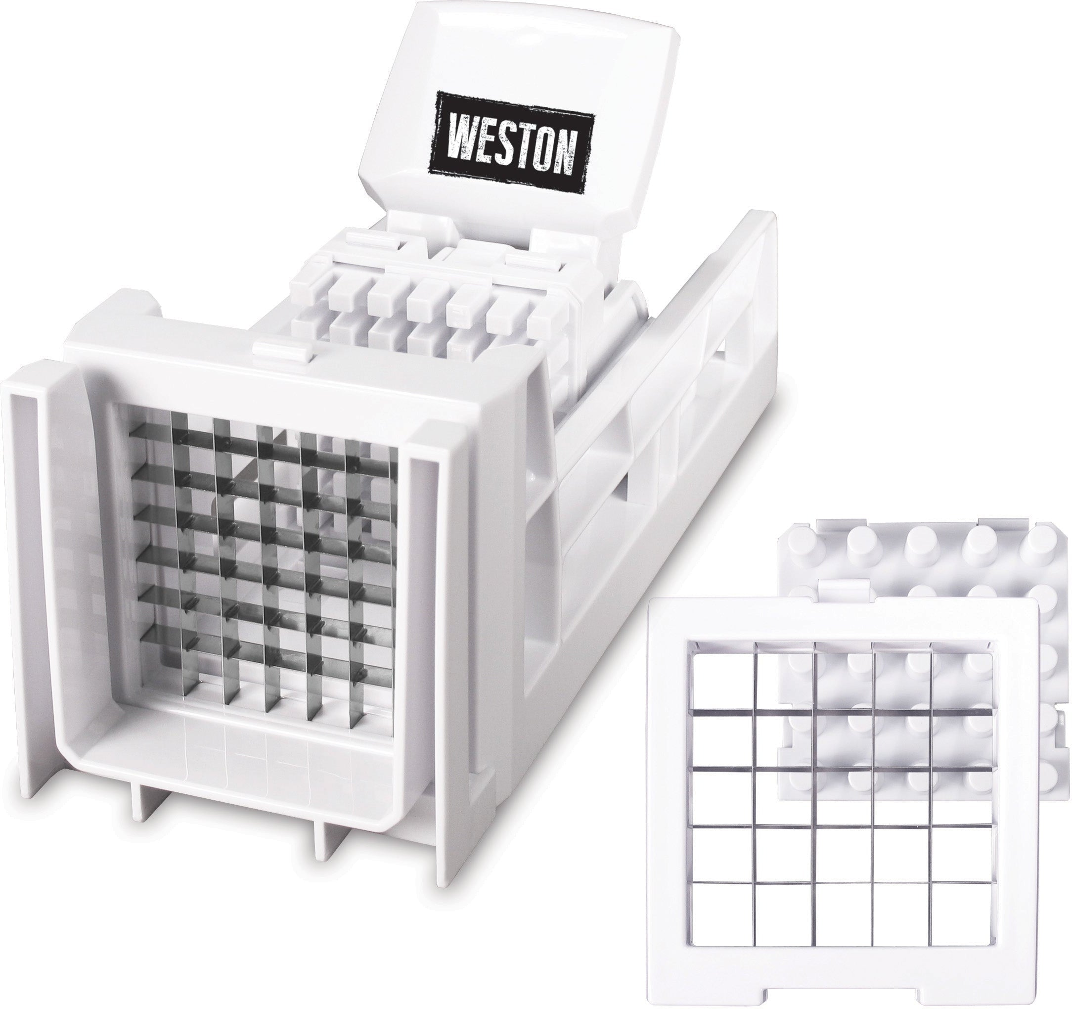 This ratchet-style French Fry Cutter is the easiest way to cut french fries or dice fruits and veggies. Simply push down on the ratchet handle and the pusher advances the food through the blades. Plus, this french fry cutter features a removable knife guide for perfect dicing of fruits and vegetables.