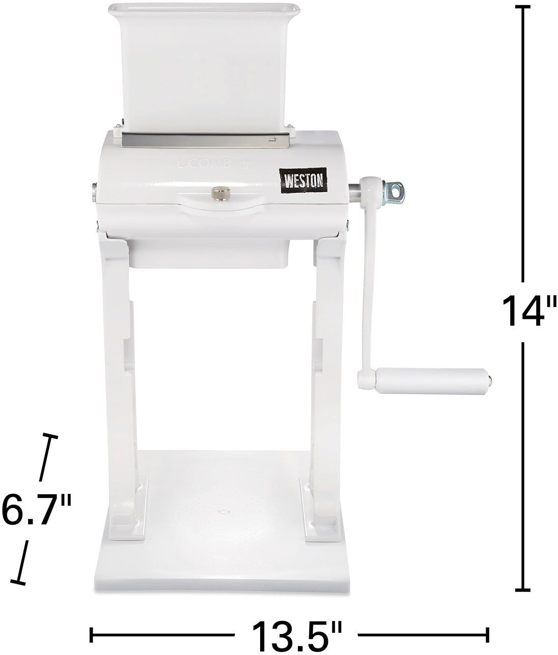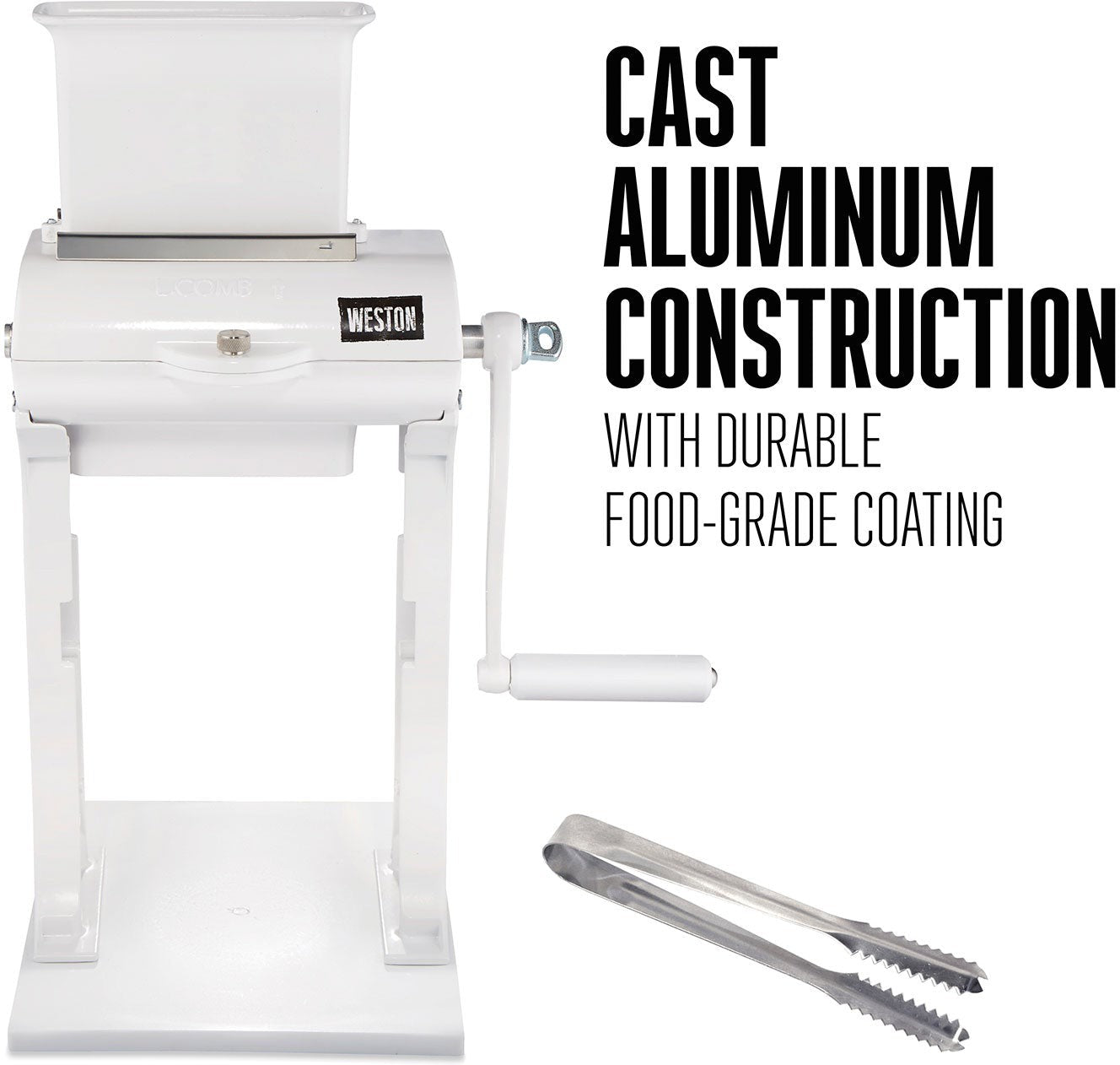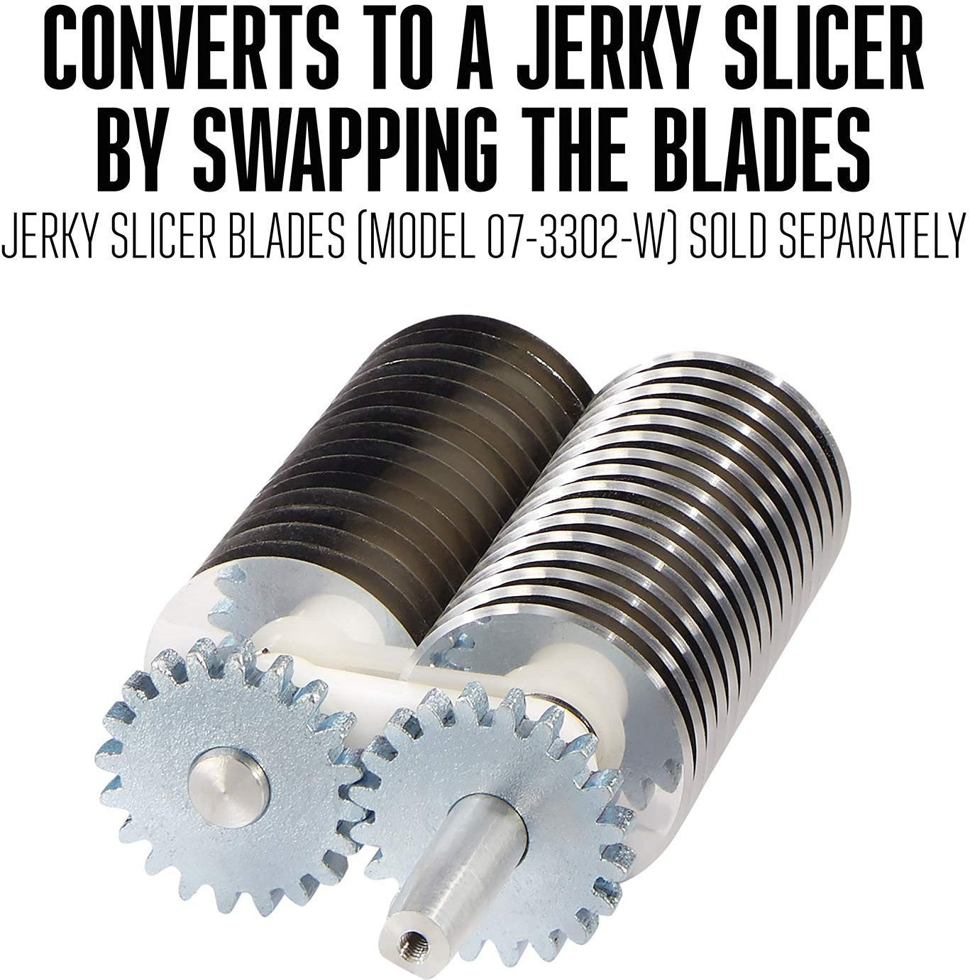 Whether you hunt or buy meat in bulk, tenderizing with the Weston Manual Meat Tenderizer/Cuber is a great way to get the best texture and flavor from any cut of meat, even less expensive and tougher cuts. It quickly and evenly tenderizes meat straight from the farm, field, refrigerator or freezer. With this durable meat tenderizer, you can process large batches of meat quickly. The 31 large-diameter tenderizing blades are housed inside a rugged, corrosion-resistant aluminum shell. Just place meat inside the large chute and turn the handle. The chute fits large pieces of meat up to 4.5" wide and .75" thick. Tenderize beef by running it through the meat tenderizer one time, or run through again in the opposite direction to make cubed steak just like the butcher or grocery store. Also great for tenderizing poultry, pork, bison and venison. The meat tenderizer/cuber has a solid, slip-free base that easily mounts on tables and other flat surface with the included C-clamps. It's built to last with a cast aluminum construction that has a durable, food-grade coating. The tenderizer/cuber easily converts to a jerky slicer by swapping the included blade with the Weston Jerky Slicer Blade (Model 07-3302-W) sold separately.