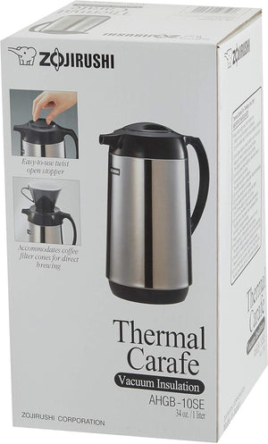 Introducing the Zojirushi 1L Polished Stainless Steel Thermal Serve Carafe (AHGB-10SEXA) – a perfect blend of elegance and functionality designed to keep your beverages at the ideal temperature for hours. Whether you're hosting a gathering or simply enjoying your favorite drink at home, this thermal carafe is a must-have for any kitchen. The Thermal Serve Carafe features a high quality vacuum glass liner with excellent heat retention and easy-to-use twist open stopper. It also accommodates coffee filter cones for direct brewing. Its sleek design is ideal for home or office use.