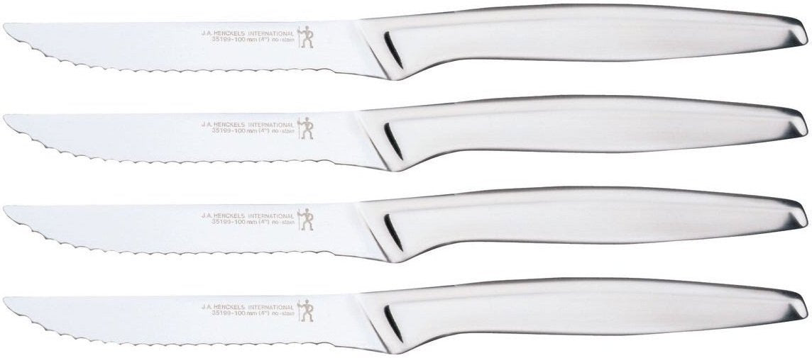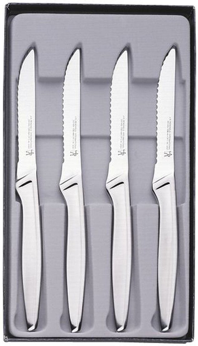 The HENCKELS stainless steel steak knives are great for any occasion where a steak knife is needed and will complement all flatware styles. The knives feature ergonomic handles with serrated blades that cut easily through meats. Set Includes 4 Pieces.