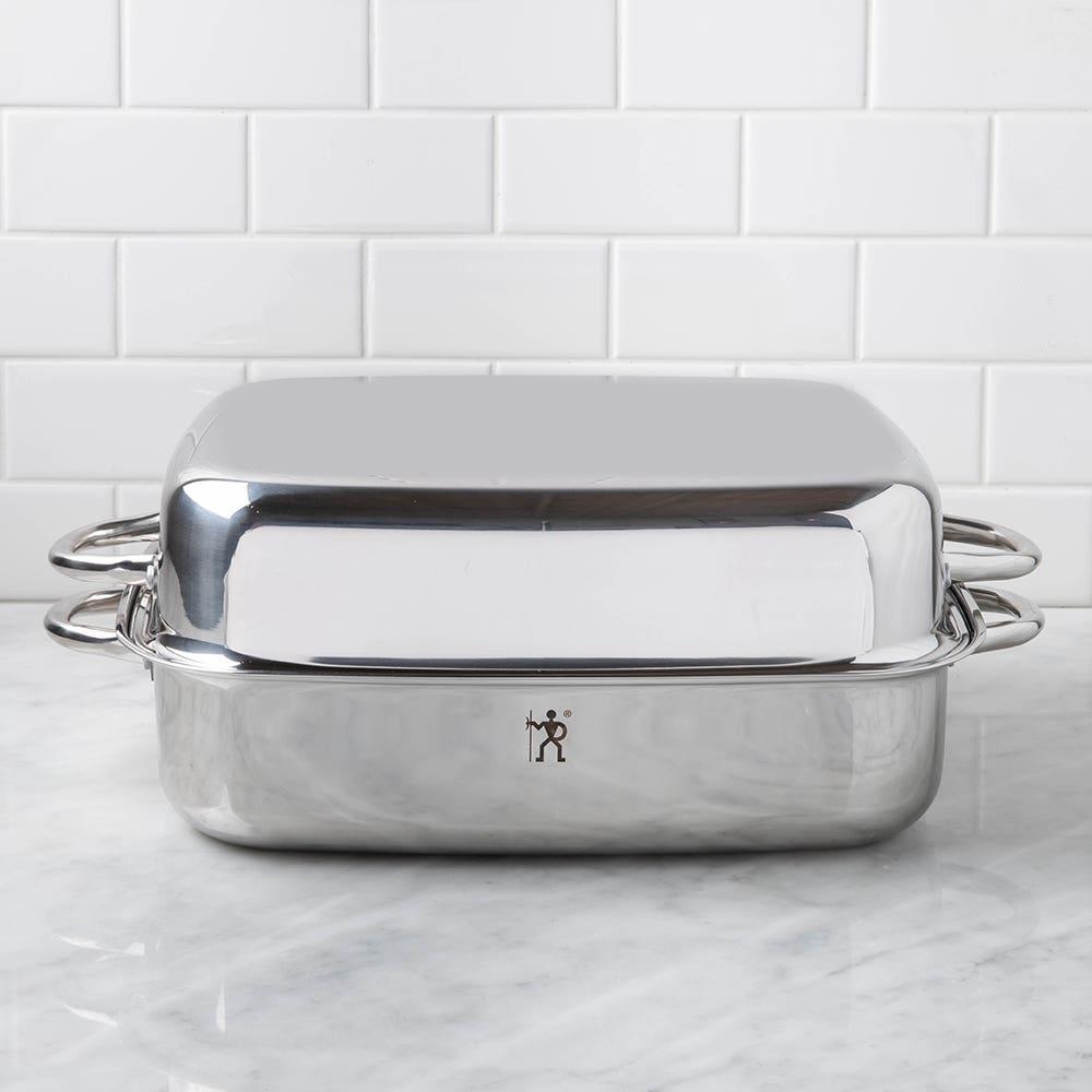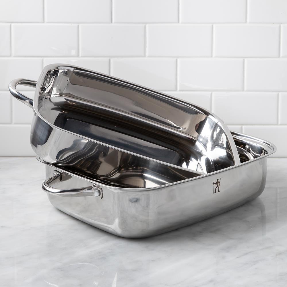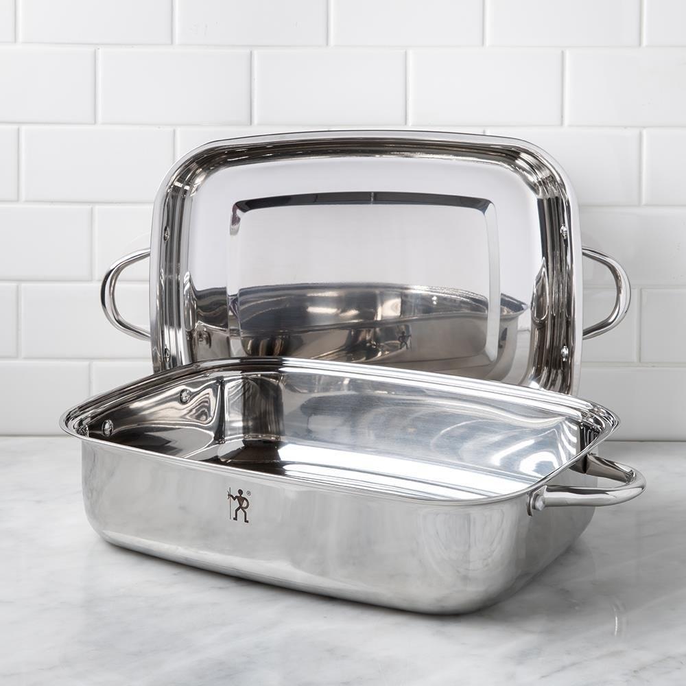 Prepare mouth-watering roasts and a variety of different foods in this premium stainless steel roaster.The J.A. Henckels International Kitchen Elements Roaster is constructed of quality stainless steel to provide optimal heat distribution and long-lasting durability. The lid doubles as a second roasting pan or serving dish.