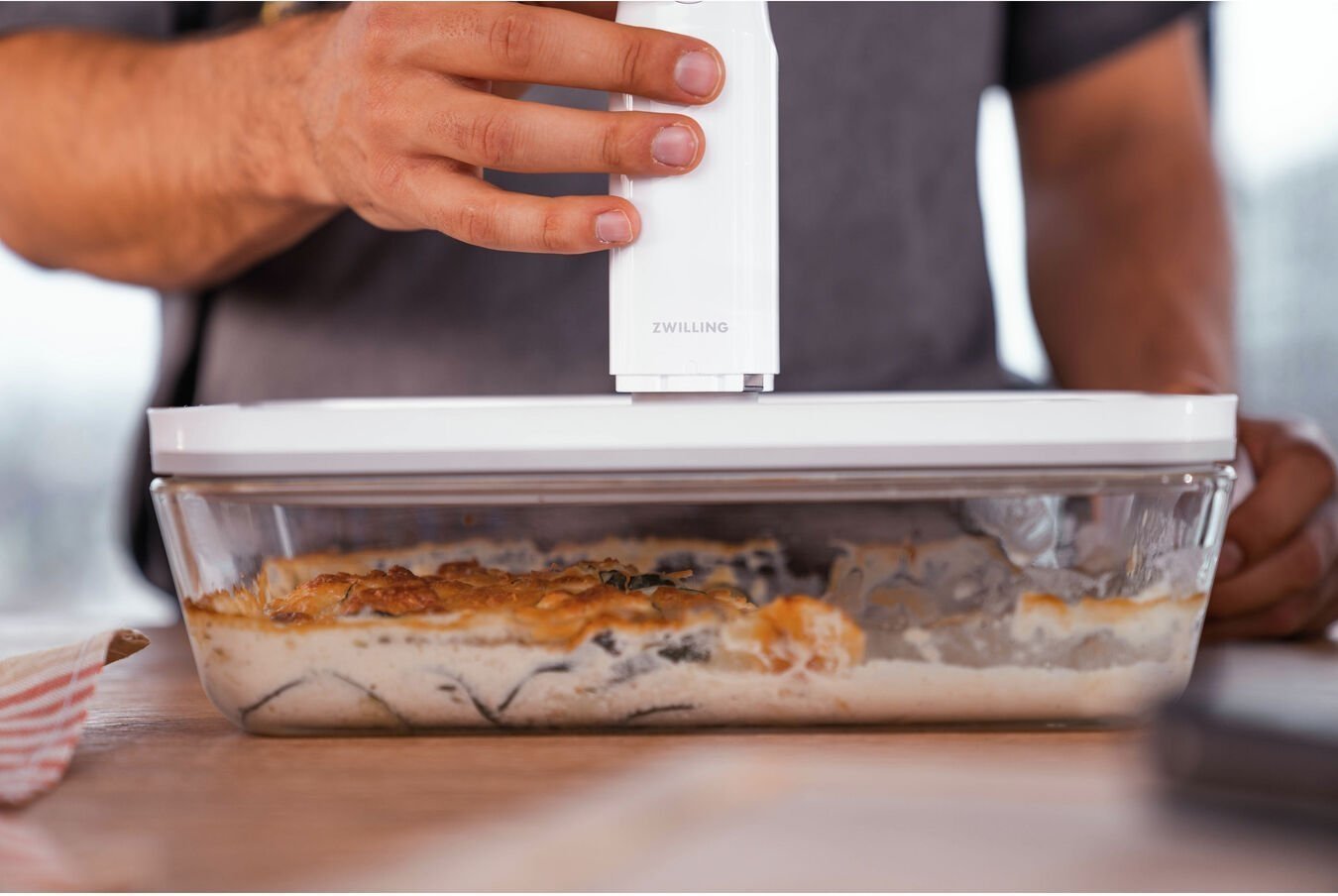 Say hello to fresh food and goodbye to food waste. Eat healthier, save time, and store your food with long-lasting freshness with the new vacuum storage system: Fresh & Save. The exclusive Fresh & Save technology preserves flavors and nutrients, prevents freezer burn, and keeps food fresh up to 5 times longer than non vacuum storage methods. Blending the power of a countertop vacuum sealer with the versatility of a handheld device, the cordless vacuum pump is fast, quiet, and easy to use. And thanks to its compact design, it will fit into any kitchen. We currently offer two starter sets available with vacuum pump, reusable BPA-free bags that are easy to close with a zipper attachment and are ideal for sous-vide cooking and microwave reheating, and either borosilicate glass or BPA-free polypropylene plastic containers. With the ZWILLING double sealing effect (most others only seal one surface) the containers shut tightly for super-fresh food. What’s more? The downloadable Culinary World app will track when you store food and when it will spoil, helping you to reduce food waste and save money. For a smart way to store food, choose Fresh & Save.