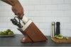 Premium knives require regular sharpening to preserve their excellent cutting performance. The new ZWILLING SharpBlock knife block with KIS Technology now does this for you. In addition to providing safe and attractive storage for your knives, it also ensures that they are always sharp. This preserves their optimal quality and you enjoy your knives even longer. The ZWILLING SharpBlock automatically sharpens knives with ceramic sharpeners built into each slot for fine edged knives (paring, slicing and chef's knives). The sharpening stones are arranged so that each knife is sharpened at the ideal angle whenever it is removed or replaced. You no longer have to think about when or how to sharpen your knives. Making sure that knives are always returned to the correct slot are self-explanatory pictograms on each slot. This completely prevents mix-ups. The 7-piece knife block not only keeps your knives optimally sharp, it’s also a real eye-catcher in your kitchen. The knife block in ash wood features a particularly wonderful grain and is fitted with a functional and attractive stainless steel cover. The block is ideal for ZWILLING Gourmet series knives, which come included. The following knives come with each block: a ZWILLING Gourmet series paring knife (10 cm), slicing knife (16 cm), chef's knife (20 cm), utility knife (13 cm), bread knife (20 cm) and TWIN L multi-purpose scissors.
