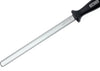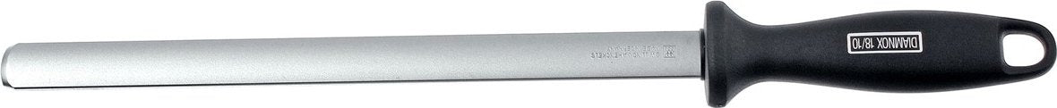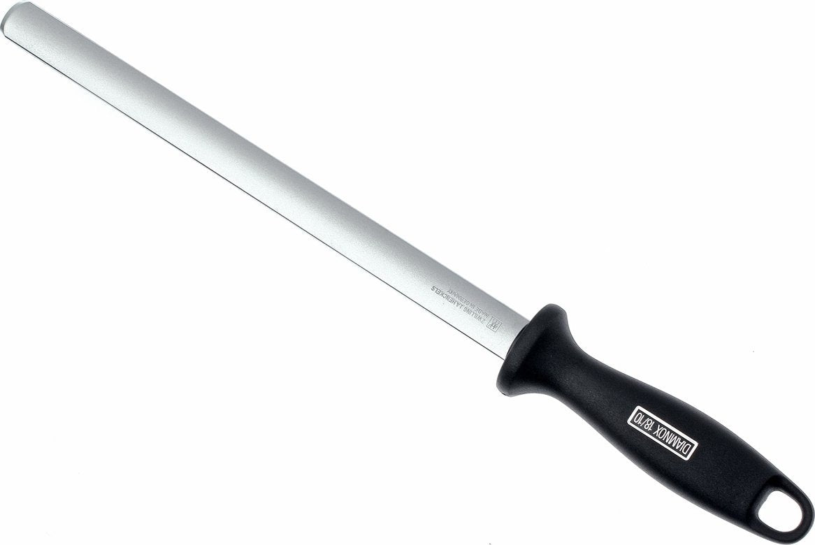 The sharpening steel has a sturdy, ergonomic handle with a hanging eyelet and an oval-shaped rod. Its diamond coating gives kitchen knives an extremely fine sharpness when honed, quickly restoring their original cutting performance. The ZWILLING knife sharpener is 26cm long and is ideal for restoring sharpness even to knives which have been in use for some time. The hard-wearing handle enables you to hold the sharpening steel securely whilst sharpening your knife blades. Simply draw the knives over the oval-shaped rod, with light yet purposeful hand movements, until you achieve the result you require. Afterwards, simply hang up the practical sharpening steel by means of the handy eyelet incorporated in the end of the handle. That way it is always to hand when you need to sharpen your knives to cut onions, fillet meat or for any other cutting tasks.