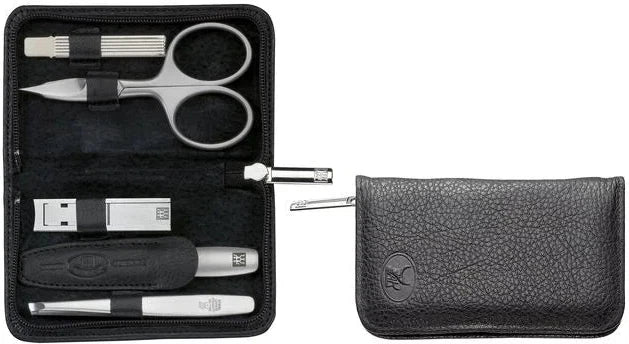The Zwilling Twinox Zip Fastener Case is a professional 5-piece nail care set from the premium TWINOX® range, designed to offer effortless manicures and pedicures. This set includes essential tools for quickly and precisely repairing nail damage, all housed in an attractive black yak leather case with a secure zip fastener. The velvet interior ensures that each tool is held securely and protected. The tools, made from matte satin-finished stainless steel, are ergonomically designed for comfort and precision. This set combines high-quality materials, meticulous craftsmanship, and an elegant design for outstanding longevity and functionality.