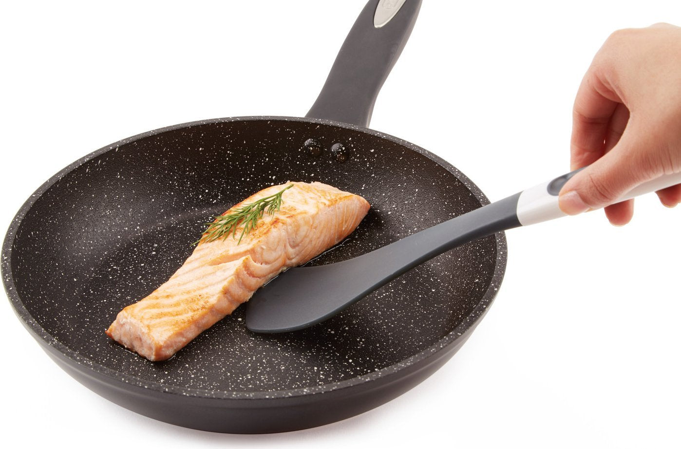 - Broad surface & an angled thin front edge is safe on nonstick cookware