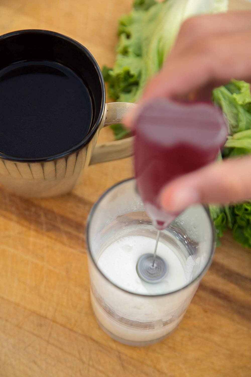 - Handheld, battery-powered milk frother