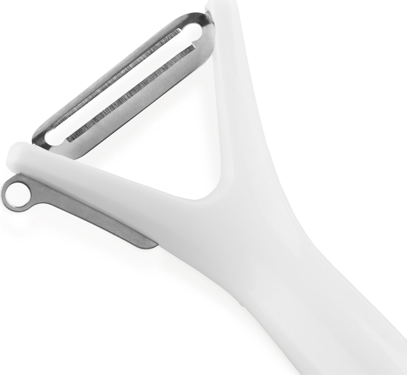 - Extra-hardened steel blade stays sharp for perfect peeling