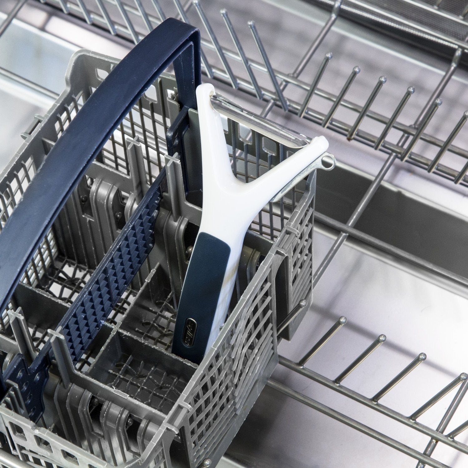 The Zyliss Y Peeler is ideal for peeling cucumbers, potatoes, carrots, and other vegetables, while its safe design keeps hands and fingers secure and away from the blade. The vegetable peeler also features a potato eye cutter on the side making peeling potatoes a breeze. You will quickly find that this is the best potato peeler you’ve ever owned! Your hands won’t tire with the ergonomically designed Y Peeler handle. The grip is well weighted and fits comfortably in almost any cooks hands. Don’t worry about dulling on this ultra sharp stainless steel, rustproof blade. If you want an apple peeler that will last for years then this is the fruit peeler for you.