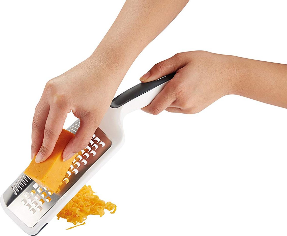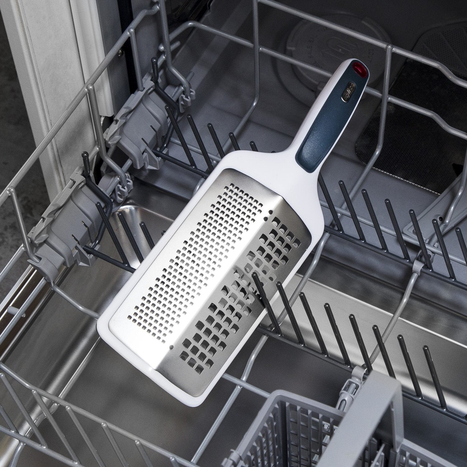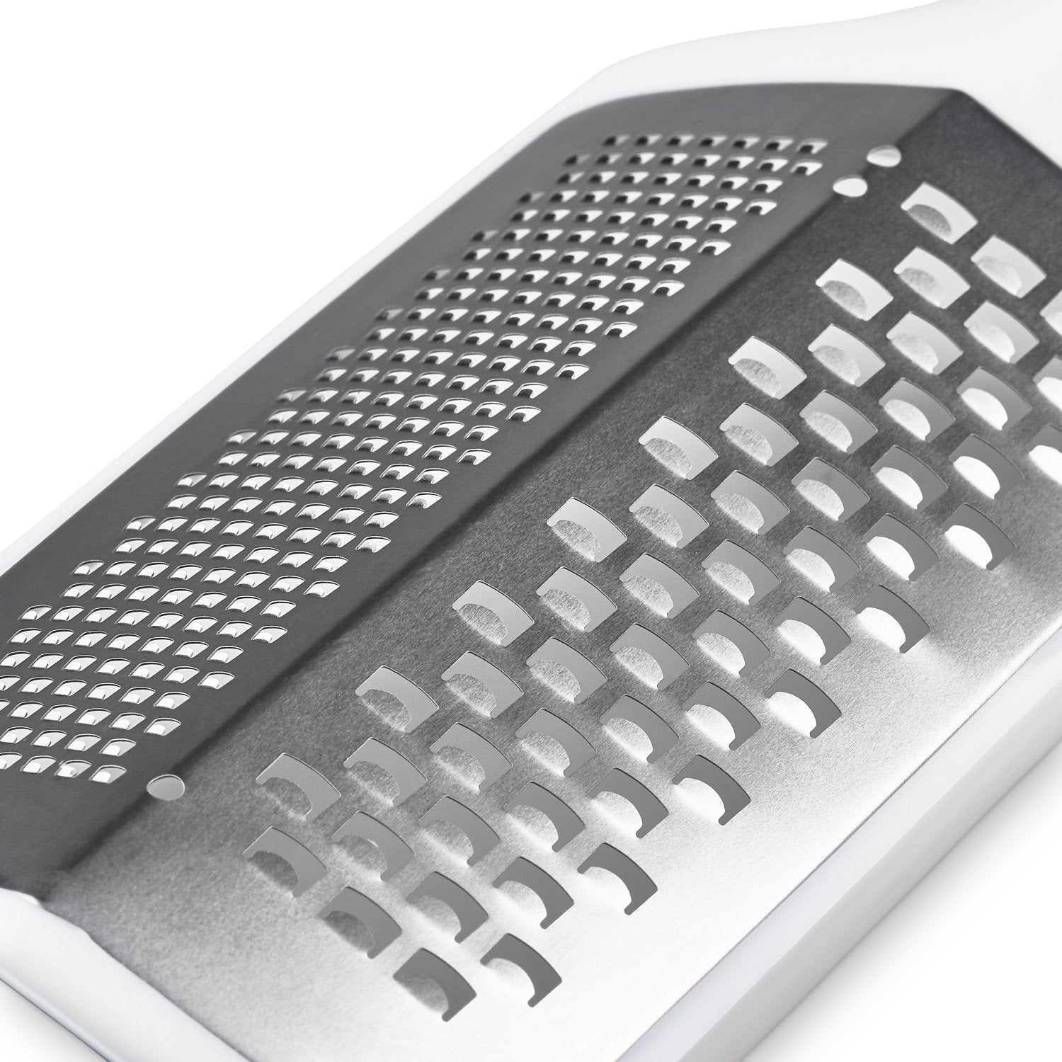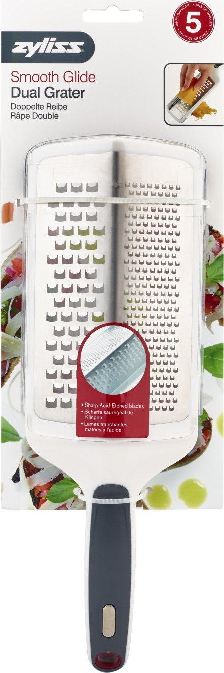The Zyliss SmoothGlide Dual Grater is the ideal grater for both soft and hard kinds of cheese, chocolates, carrots and more. One side of the grater is coarse and the other side is fine. The ergonomic handle allows the grater to be held comfortably and the stainless steel surface will not rust. It’s acid-etched blades grate precisely without tearing or ripping food. Food glides effortlessly over the blades without sticking.